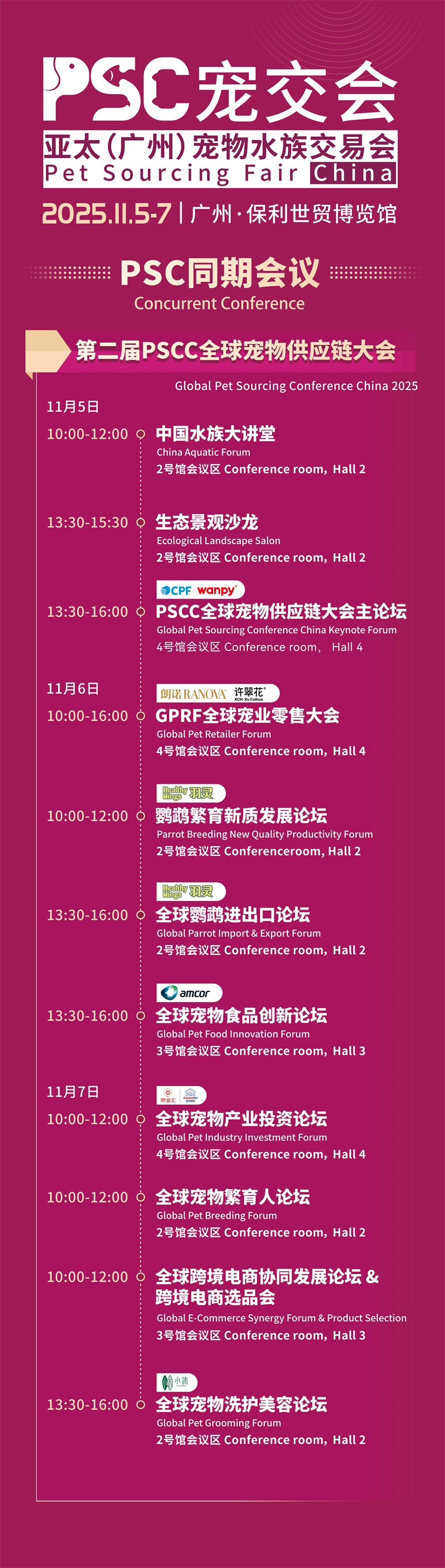 Одновременно будут проводиться 11 профессиональных конференций высокой концентрации, на которых более 70 мировых лидеров отрасли поделятся своими идеями. 2-я конференция PSCC по глобальной цепочке поставок домашних животных будет посвящена таким популярным темам, как пищевые инновации, инвестиции в промышленность, трансграничная электронная коммерция, разведение и уход. Глобальная конференция по розничной торговле домашними животными GPRF будет непосредственно решать болевые точки розничной торговли. Подотрасли также будут насыщены яркими моментами, в том числе лекционным залом китайского аквариума и Глобальным форумом по импорту и экспорту попугаев, которые будут конкретно охватывать сектора аквариумов и мелких домашних животных. Эта выставка, охватывающая все аспекты потребностей, от практических технологий до стратегического планирования, предлагает передовые идеи и решения для развития индустрии домашних животных. Конкретные меры заключаются в следующем: