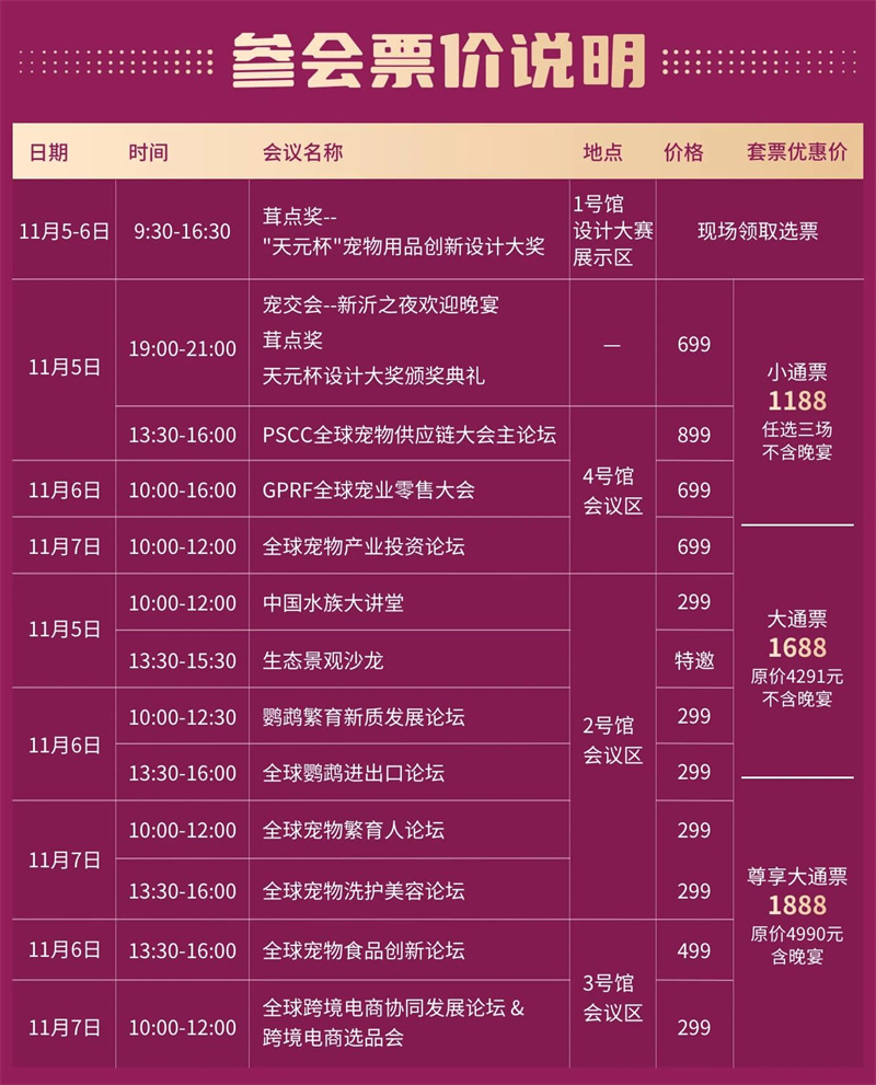 Инновационные конкурсы и презентации новой продукции:Премия за инновационный дизайн товаров для домашних животных «Кубок Тяньюань» пройдет 5–6 ноября с 9:00 до 16:30 в выставочной зоне конкурса дизайна в зале 1 и будет посвящена защите окружающей среды и интеллектуальному дизайну; Выставочная зона новых продуктов и предметов роскоши будет открыта с 5 по 7 ноября в выставочной зоне новых продуктов в зале 1, привлекая 92% профессиональных покупателей в качестве своей первой остановки, демонстрируя передовые продукты со всего мира;