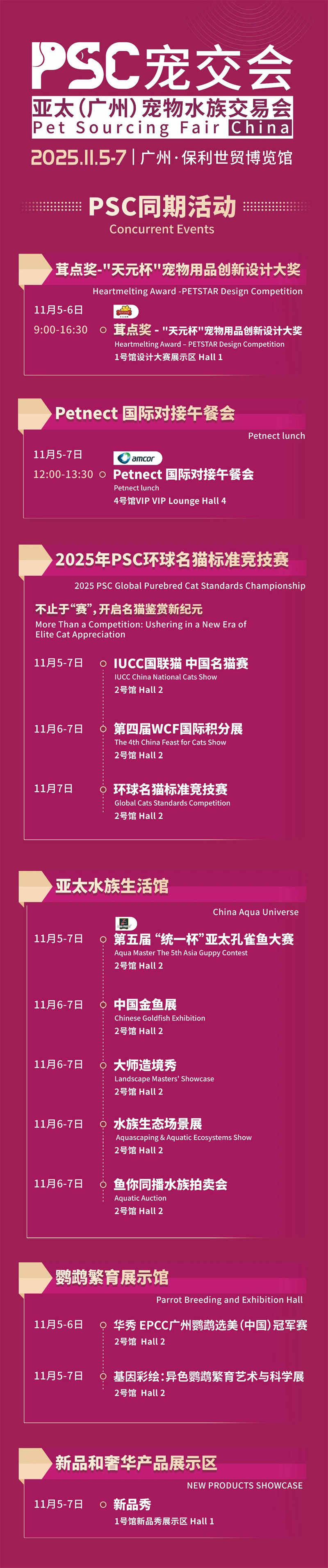 Рекомендуемые соревнования:Глобальный конкурс стандартов кошек PSC 2025 года пройдет с 5 по 7 ноября в Зале 2, включая Национальную выставку кошек IUCC (5-7 ноября), 4-ю Международную выставку очков WCF (6-7 ноября) и Глобальный конкурс стандартов кошек (7 ноября), открывая новую эру признания породистых кошек; Тематические выставки: Павильон «Образ жизни в аквариумах Азиатско-Тихоокеанского региона» будет представлен в зале 2 с 5 по 7 ноября и будет посвящен 5-му Азиатско-Тихоокеанскому конкурсу гуппи «Объединенный кубок», выставке «Китайская золотая рыбка», выставке Master Creation Show и выставке «Экологическая сцена аквариума». Аквариумный аукцион «Рыба и ты транслируем вместе» пройдет одновременно 6 и 7 ноября; С 5 по 6 ноября в выставочном зале по разведению попугаев пройдет чемпионат по конкурсу красоты попугаев Хуасю EPCC в Гуанчжоу (Китай) в зале 2, а с 5 по 7 ноября пройдет выставка «Генная живопись: искусство и наука о разведении попугаев разного цвета», охватывающая такие подобласти, как аквариумы и попугаи.